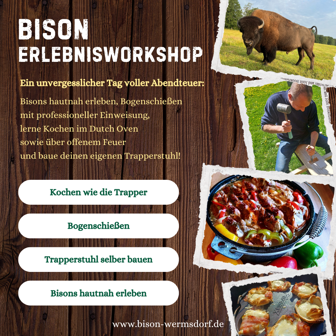 | Sa, 27.06.2026 | 10-17Uhr | Bison-Erlebnisworkshop Ein Tag voller Abendteuer – Nur vorab buchbar! Plätze begrenzt! – ![]() | Bisongehege Wermsdorf |