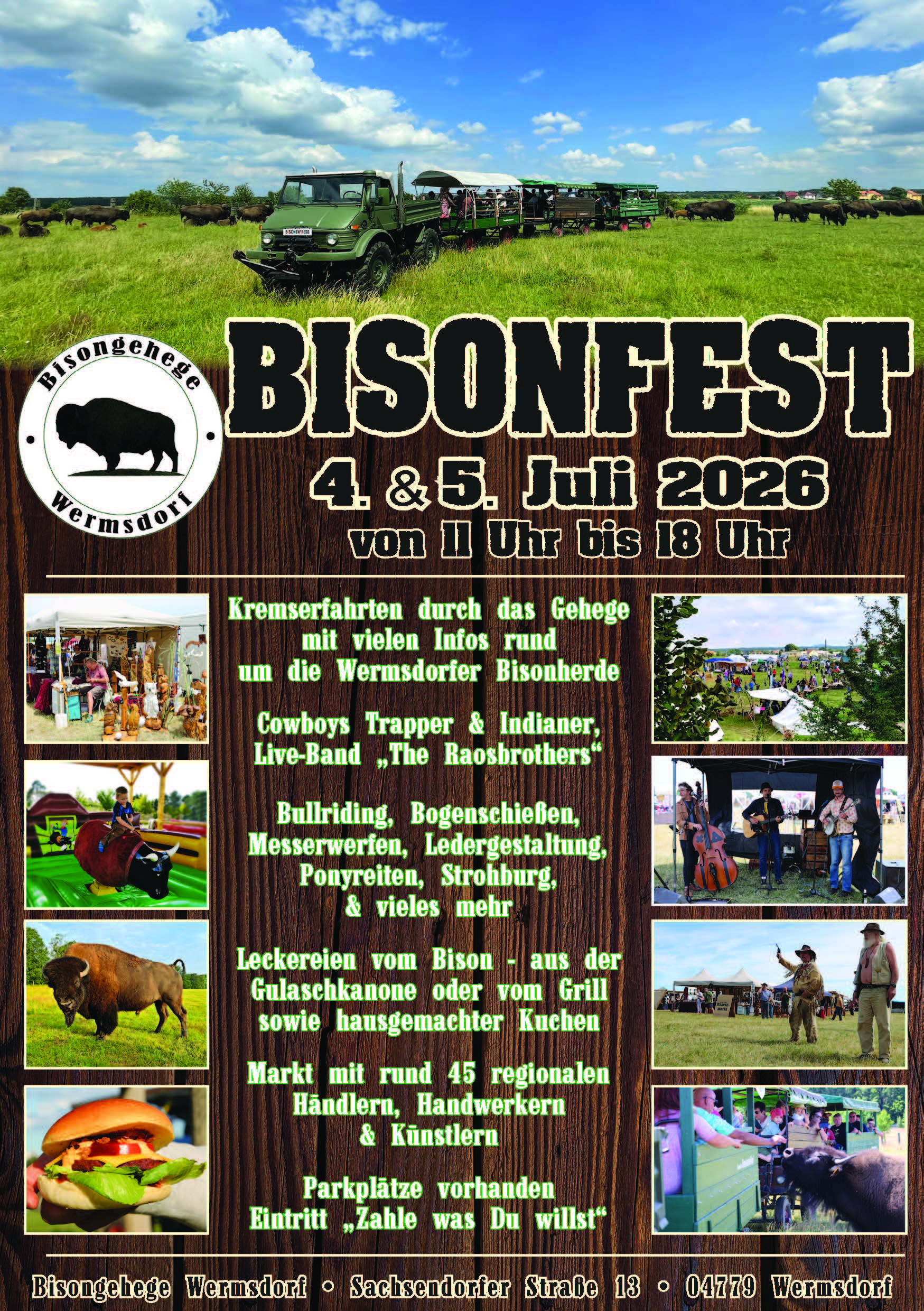 | Sa, 04.07.2026 & So, 05.07.2026 | 11-18Uhr | Wermsdorfer Bisonfest Beim Wermsdorfer Bisonfest erleben Sie Cowboys, Trapper und Indianer, einen bunten Handwerkermarkt und viele Genüsse Rund um unsere Bisons. ![]() | Bisongehege Wermsdorf |