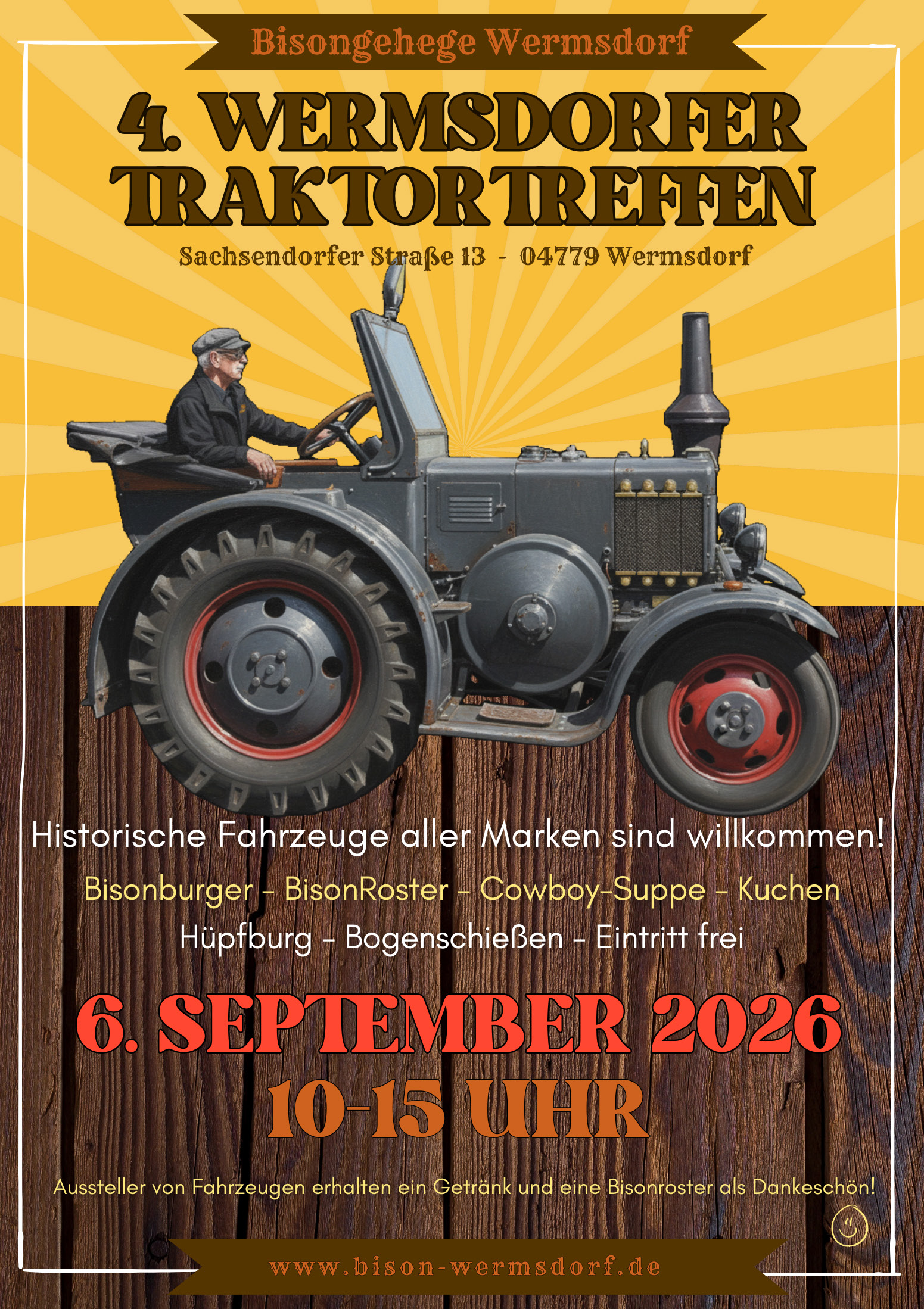 | Sa, 06.09.2026 | 10-15 Uhr | 4. Wermsdorfer Traktortreffen Traktoren, historische Autos, Motorräder und Roller – ein Muss für alle Fans nostalgischer Technik! ![]() | Bisongehege Wermsdorf |