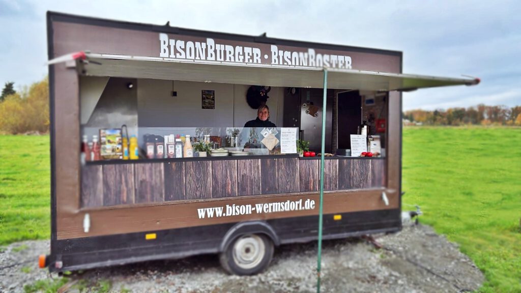 Neben dem Verkauf bereiten wir in unserem Bison-Imbiss leckere Bison-Spezialitäten vom Grill zu. So können Sie unser Bisonfleisch direkt vor Ort probieren und ein warmes Mittagessen in einzigartiger Atmosphäre genießen.
